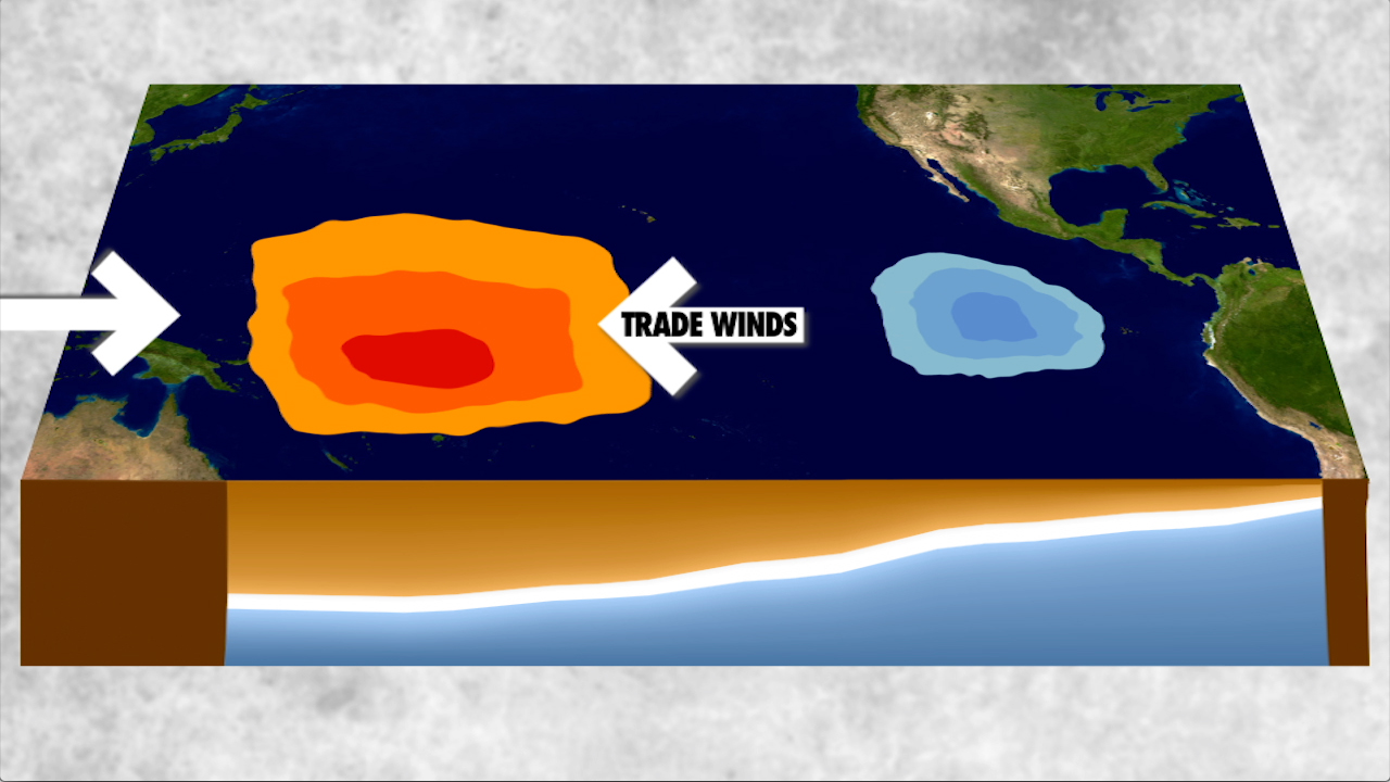 * सामान्य स्थिति: व्यापारिक हवाएँ (Trade Winds) पूर्व से पश्चिम (अमेरिका से एशिया की ओर) चलती हैं। वे गर्म सतही जल को इंडोनेशिया की ओर धकेलती हैं, जिससे दक्षिण अमेरिका के तट पर नीचे से ठंडा, पोषक तत्वों से भरपूर पानी ऊपर आता है (Upwelling)।